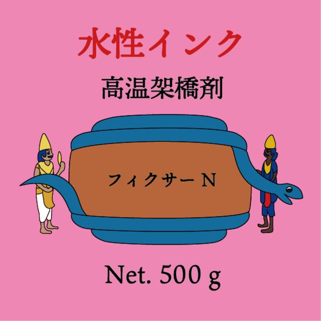 水性インクの堅牢度向上剤です。 水性インクは乾いた後も水につかると樹脂が水分を含み柔らかくなります。 この状態で擦れると、プリント剥がれや、色移りの原因になります。 フィクサーNを3%加える事で樹脂が柔らかくなるのを防ぎます。 印刷後に140度x3分の熱を加えて使用します。 常温では効果がありません。 インクに本製品を添加したまま長期保存可能です。